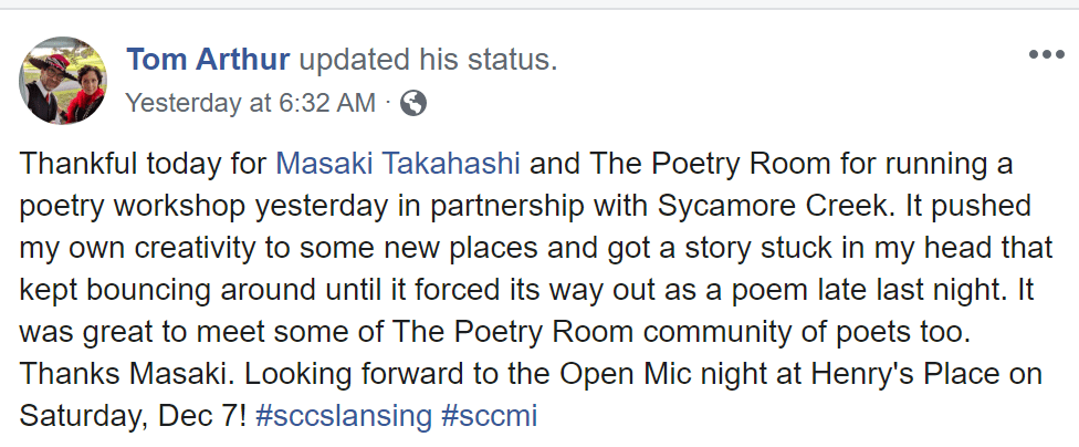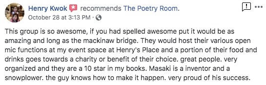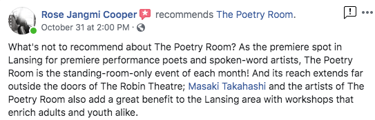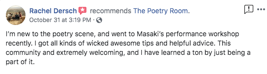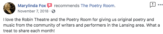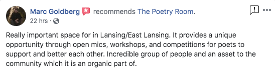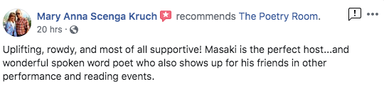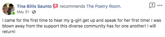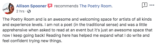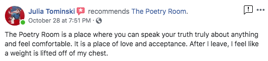The Poetry Room strives to create a safe space and a place where people can hone their skills to master their craft. From my years of experience, I believe poetry helps heal emotional pain, creates greater self awareness, improves articulation, and creates courage for the community.